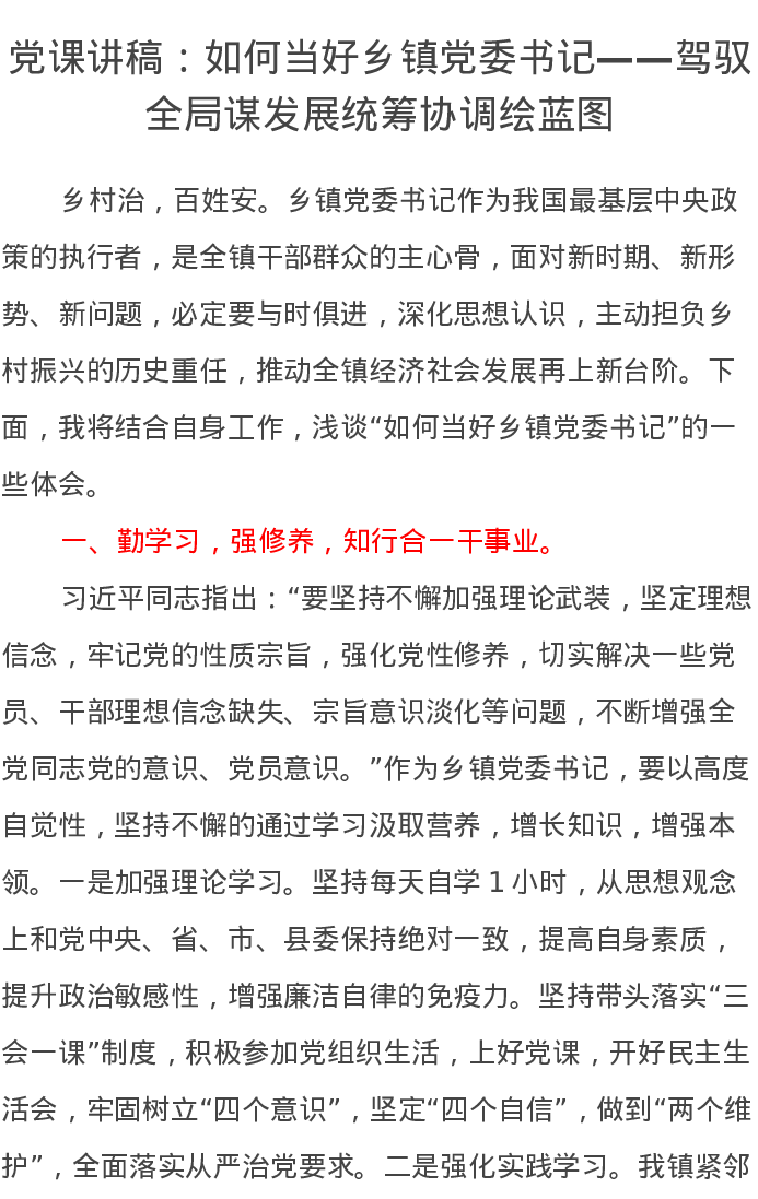 党课讲稿:如何当好乡镇党委书记——驾驭全局谋发展统筹协调绘蓝图