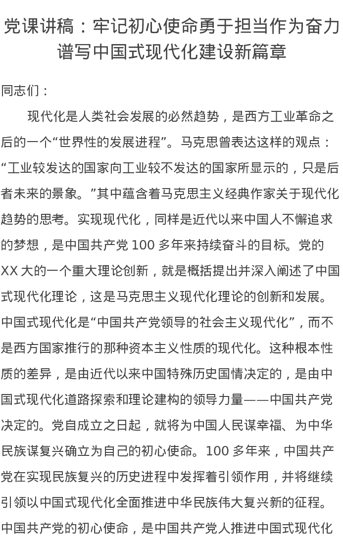 党课讲稿:牢记初心使命勇于担当作为奋力谱写中国式现代化建设新篇章