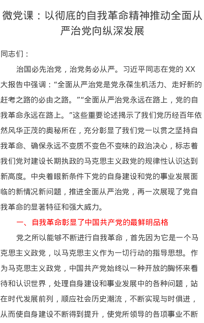 微党课讲稿:以彻底的自我革命精神推动全面从严治党向纵深发展