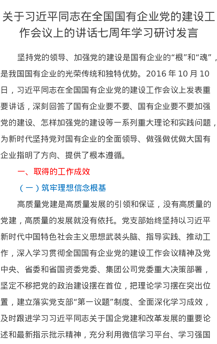 关于习近平总书记在全国国有企业党的建设工作会议上的讲话七周年学习研讨发言
