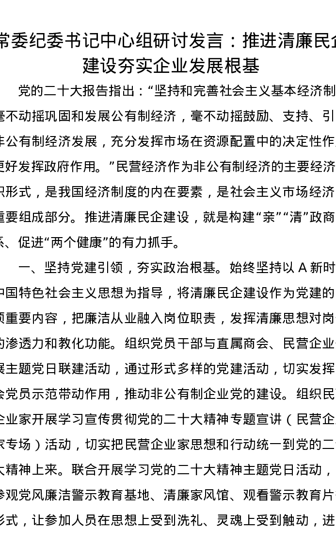 常委纪委书记中心组研讨发言:推进清廉民企建设夯实企业发展根基