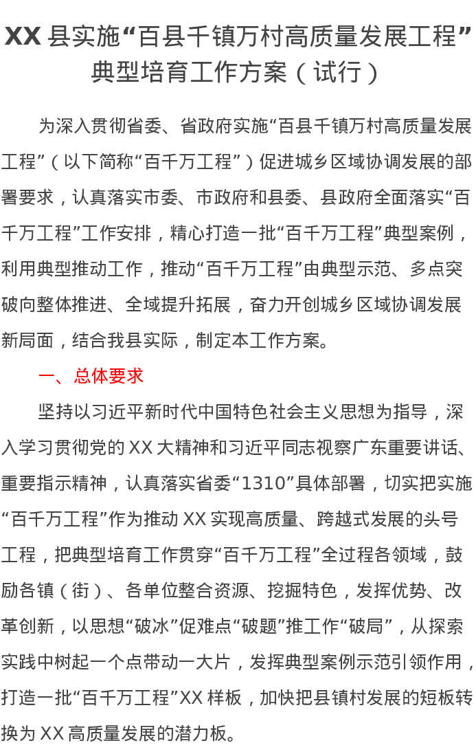 XX县实施“百县千镇万村高质量发展工程”典型培育工作方案(试行)