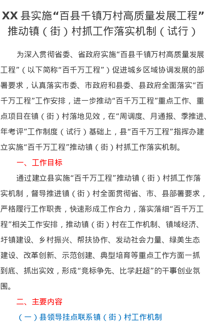 XX县实施“百县千镇万村高质量发展工程”推动镇(街)村抓工作落实机制(试行)