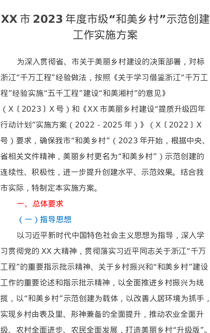 XX市2023年度市级“和美乡村”示范创建工作实施方案