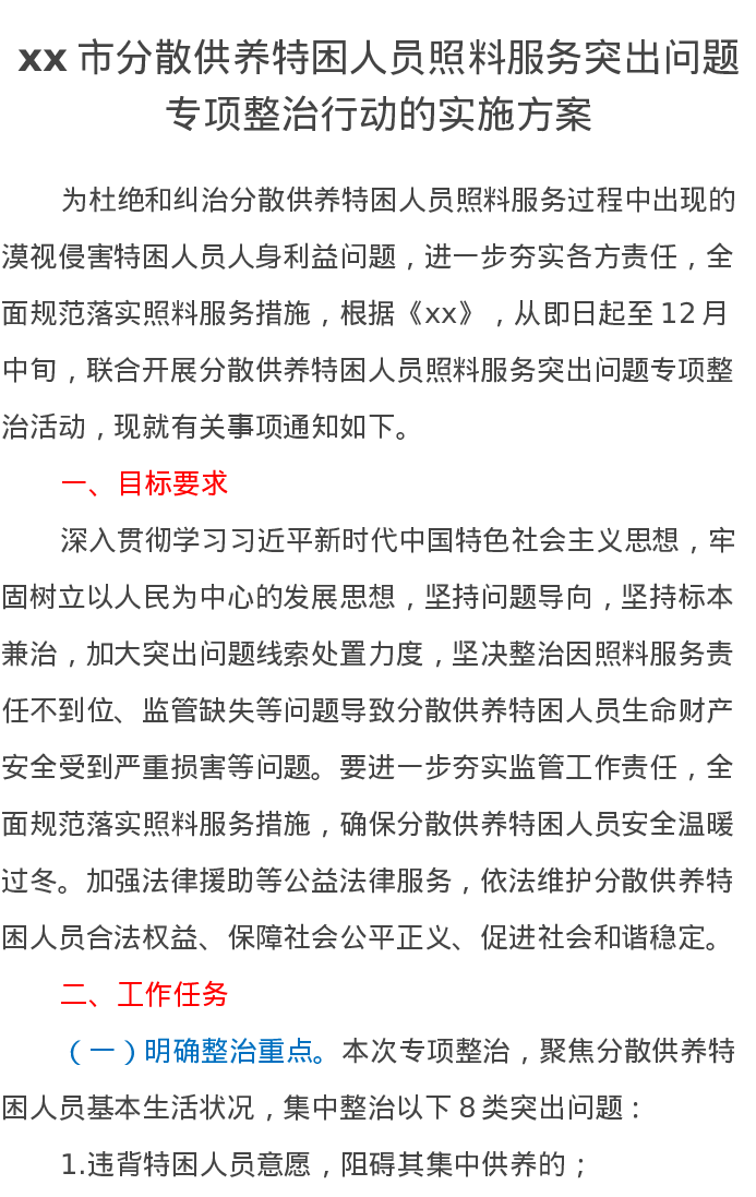 xx市分散供养特困人员照料服务突出问题专项整治行动的实施方案
