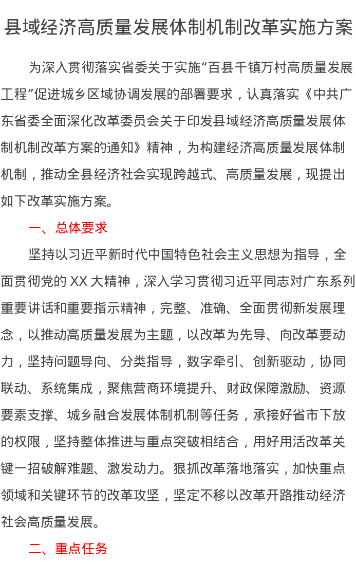 县域经济高质量发展体制机制改革实施方案