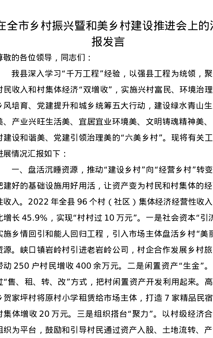 在全市乡村振兴暨和美乡村建设推进会上的汇报发言