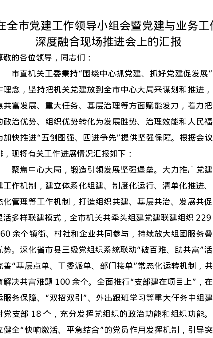 在全市党建工作领导小组会暨党建与业务工作深度融合现场推进会上的汇报