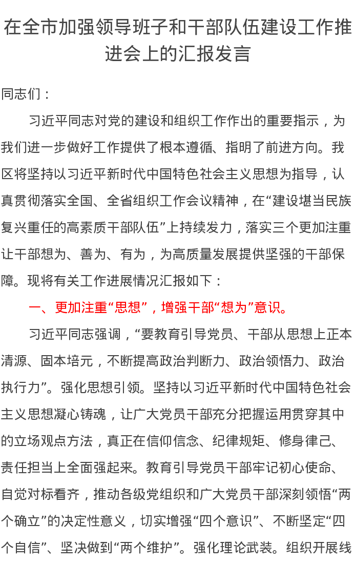 在全市加强领导班子和干部队伍建设工作推进会上的汇报发言