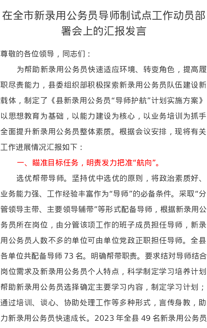 在全市新录用公务员导师制试点工作动员部署会上的汇报发言
