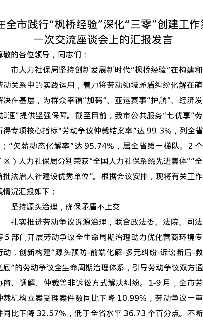 在全市践行“枫桥经验”深化“三零”创建工作第一次交流座谈会上的汇报发言