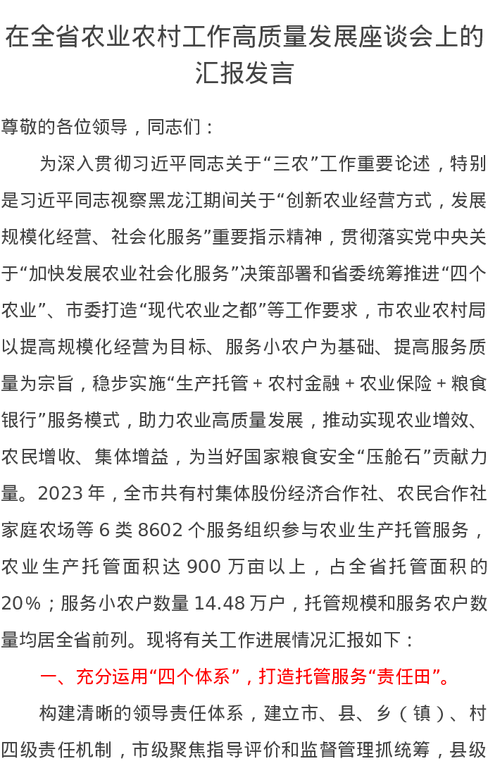 在全省农业农村工作高质量发展座谈会上的汇报发言
