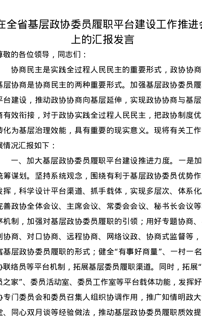 在全省基层政协委员履职平台建设工作推进会上的汇报发言