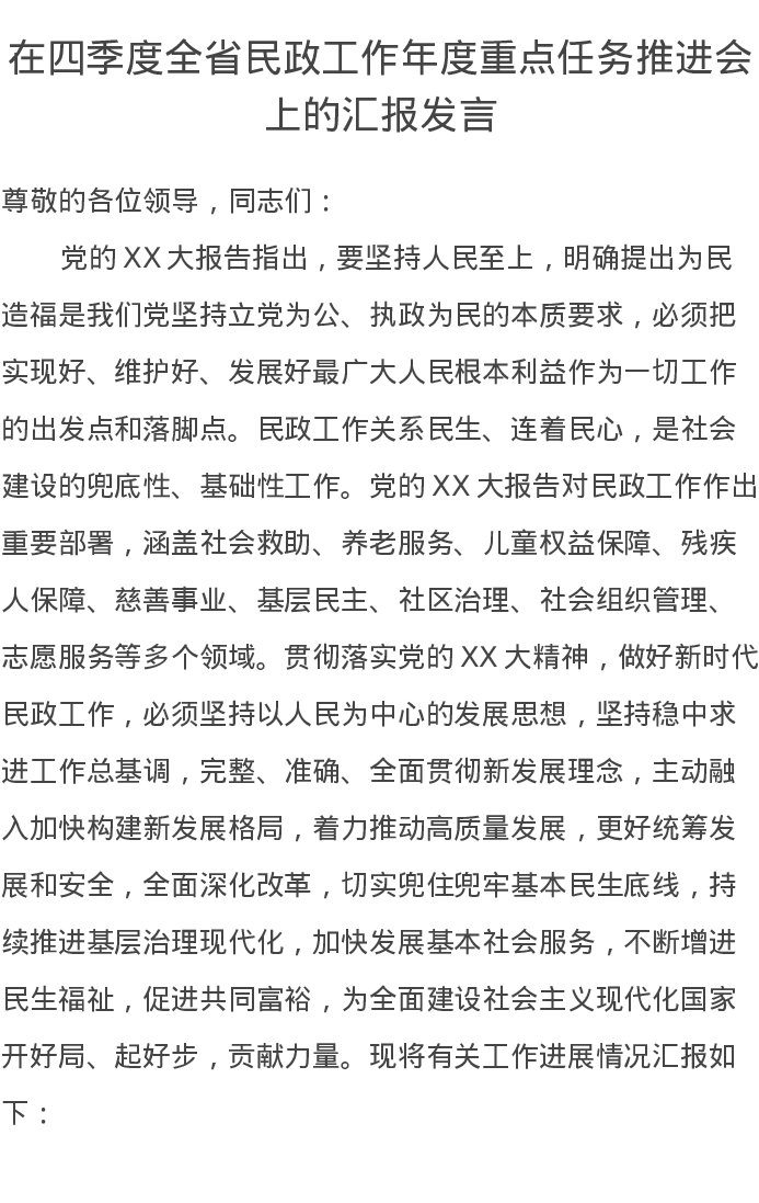 在四季度全省民政工作年度重点任务推进会上的汇报发言