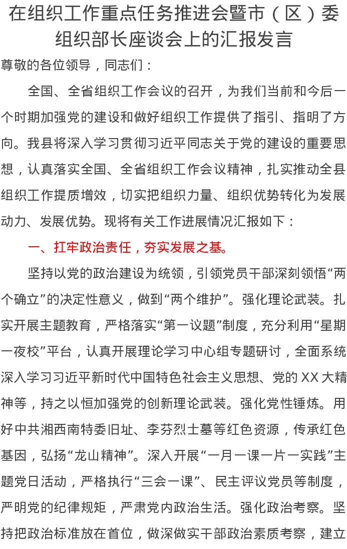 在组织工作重点任务推进会暨市(区)委组织部长座谈会上的汇报发言