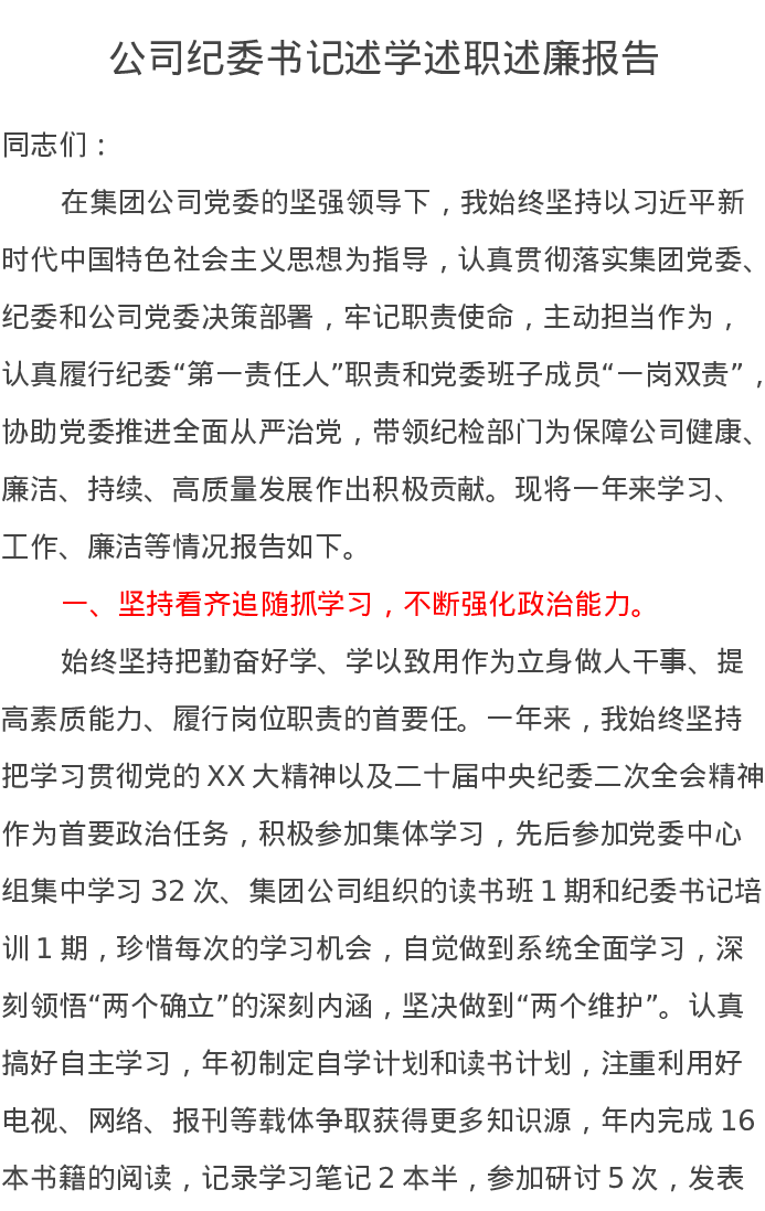 公司纪委书记述学述职述廉报告