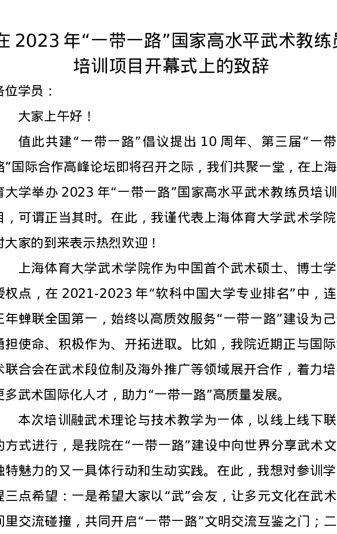 在2023年“一带一路”国家高水平武术教练员培训项目开幕式上的致辞