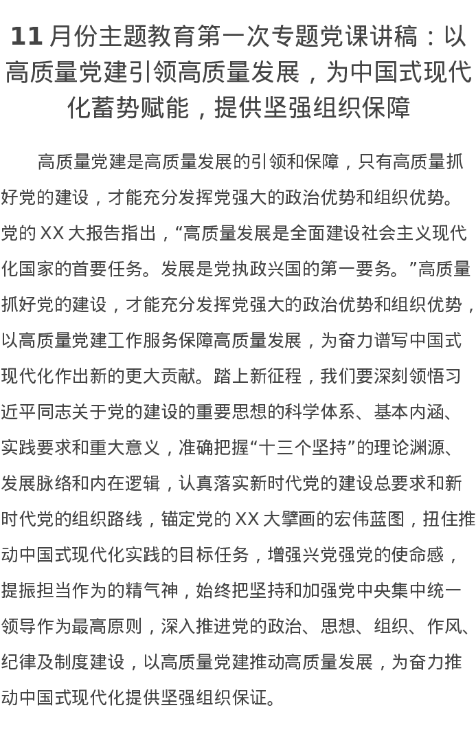 11月份主题教育第一次专题党课讲稿:以高质量党建引领高质量发展,为中国式现代化蓄势赋能,提供坚强组织保障(特色社会主义思想)