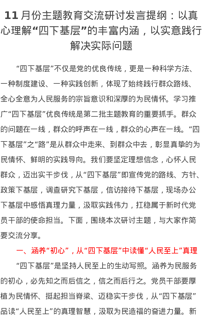 11月份第二批主题教育交流研讨发言提纲:以真心理解“四下基层”的丰富内涵,以实意践行解决实际问题(特色社会主义思想)