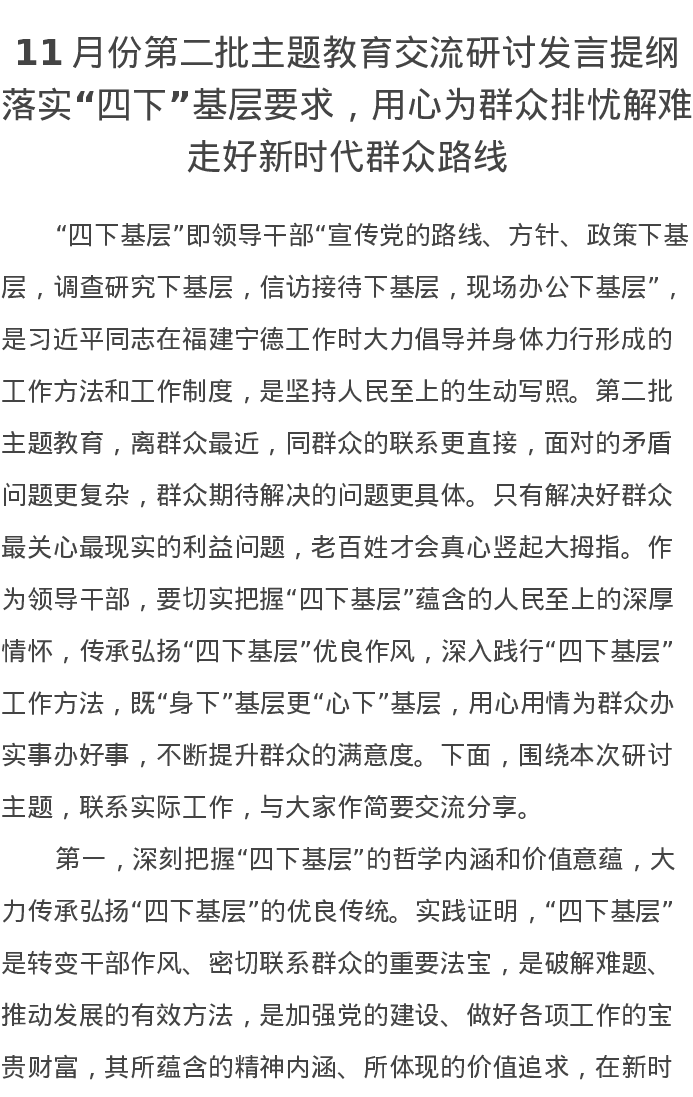 11月份第二批主题教育交流研讨发言提纲:落实“四下”基层要求,用心为群众排忧解难,走好新时代群众路线(特色社会主义思想)