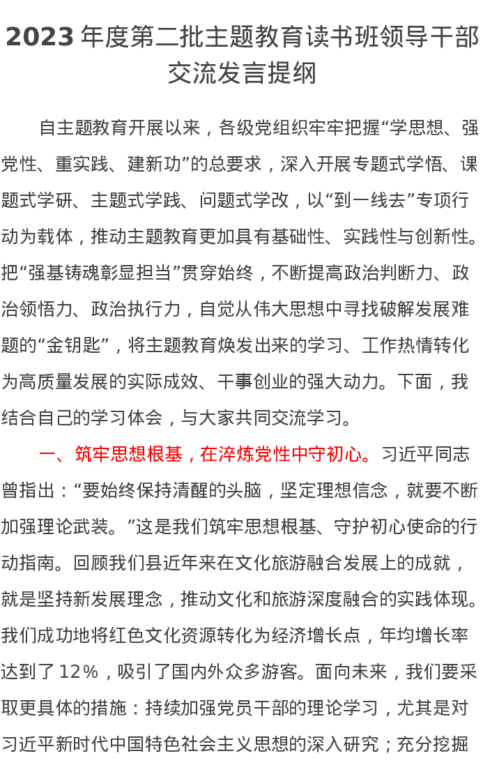 2023年度第二批主题教育读书班领导干部交流发言提纲(特色社会主义思想)