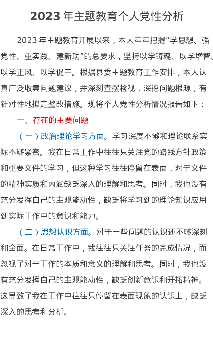 2023年第二批主题教育个人党性分析(特色社会主义思想)