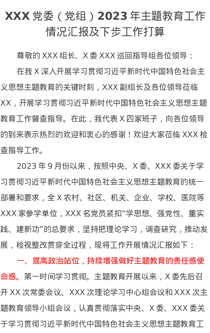 XXX党委(党组)2023年第二批主题教育工作情况汇报及下步工作打算(特色社会主义思想)
