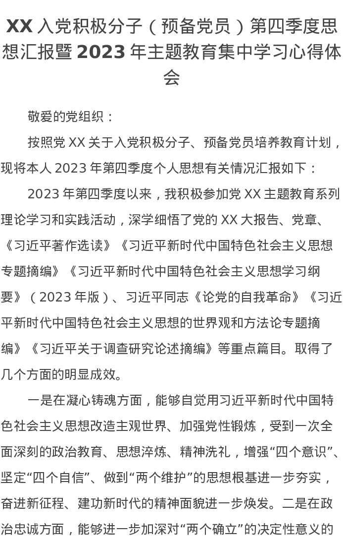 XX入党积极分子(预备党员)第四季度思想汇报暨2023年主题教育集中学习心得体会(特色社会主义思想)