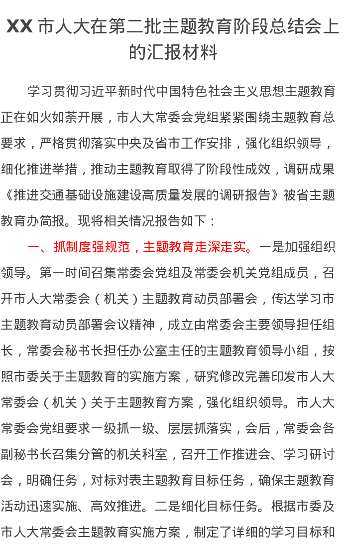 XX市人大在第二批主题教育阶段总结会上的汇报材料(特色社会主义思想)