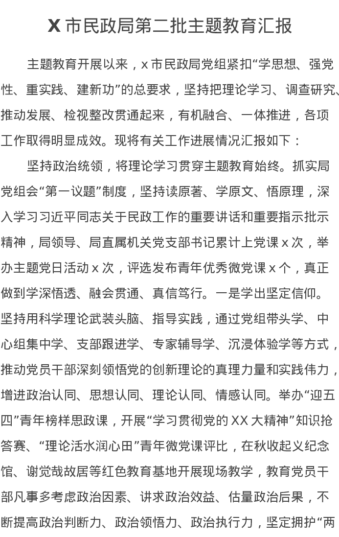 X市民政局第二批主题教育汇报(特色社会主义思想)