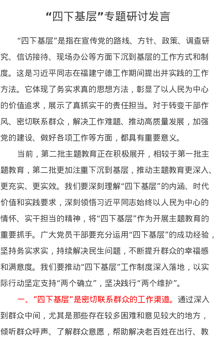 “四下基层”专题研讨发言(特色社会主义思想主题教育)
