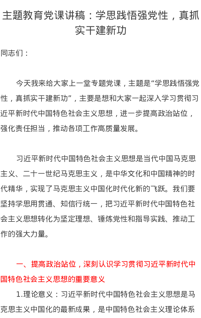 主题教育党课讲稿:学思践悟强党性,真抓实干建新功(特色社会主义思想)