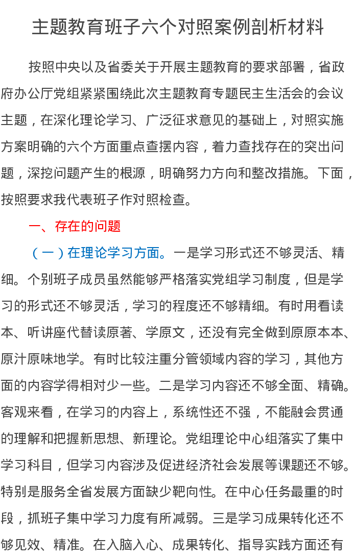 主题教育班子六个对照案例剖析材料(特色社会主义思想)