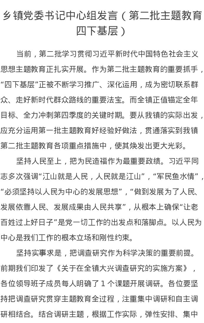 乡镇党委书记中心组发言(第二批主题教育四下基层)(特色社会主义思想)