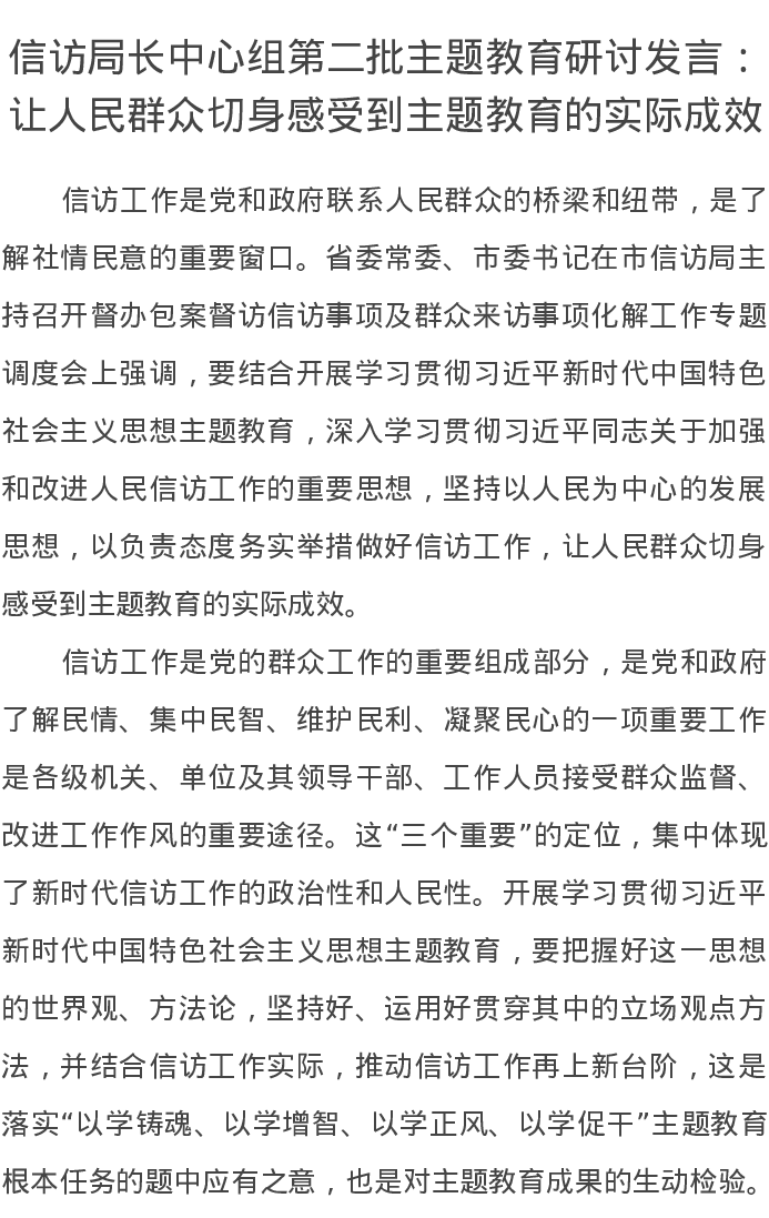 信访局长中心组第二批主题教育研讨发言:让人民群众切身感受到主题教育的实际成效(特色社会主义思想)