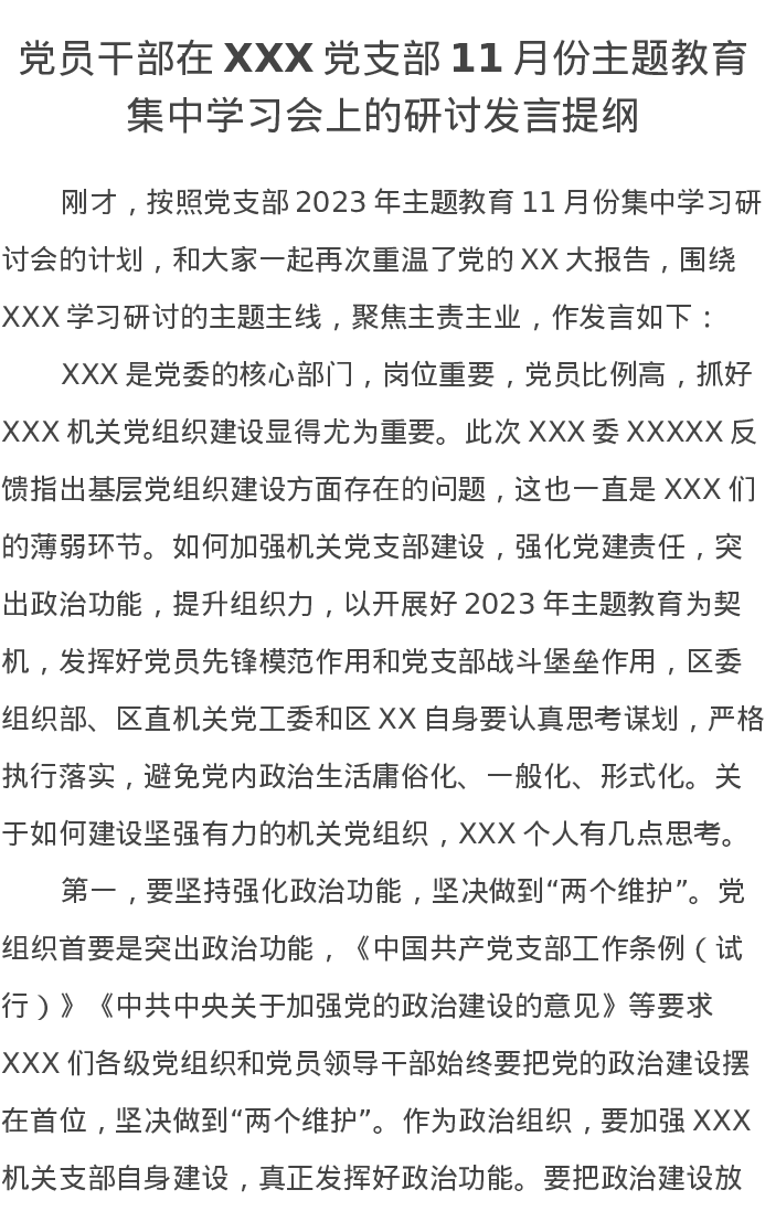党员干部在XXX党支部11月份主题教育集中学习会上的研讨发言提纲(特色社会主义思想)