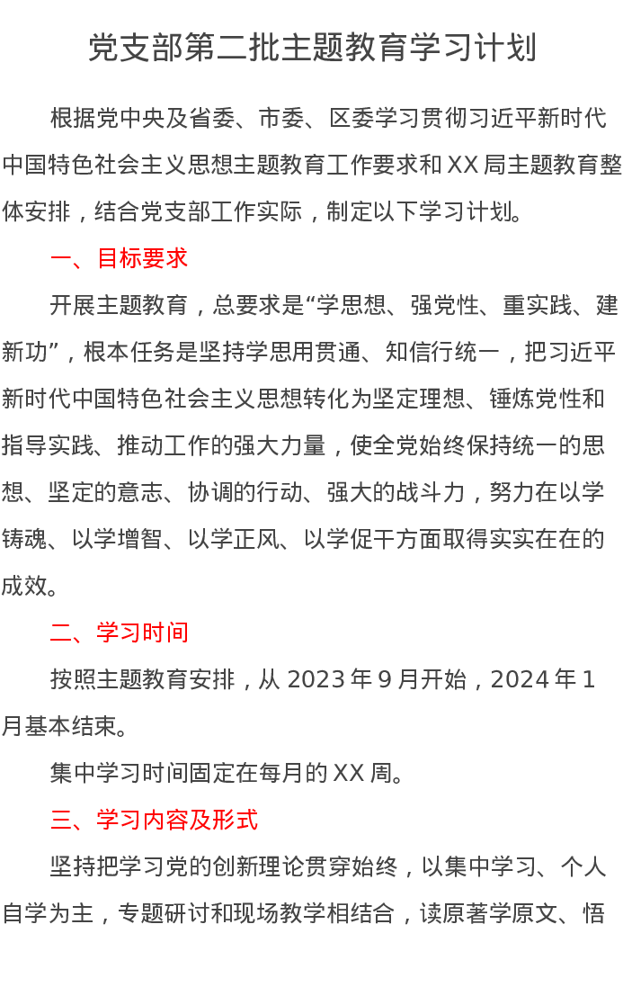 党支部第二批主题教育学习计划(特色社会主义思想)