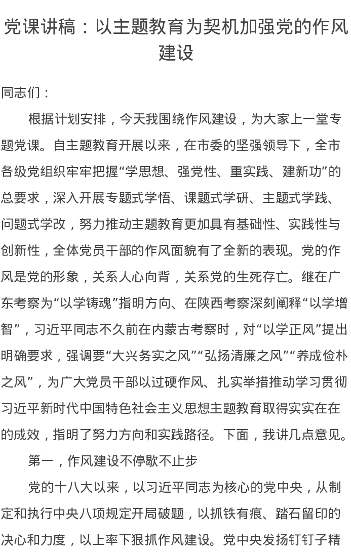 党课讲稿:以主题教育为契机加强党的作风建设(特色社会主义思想)