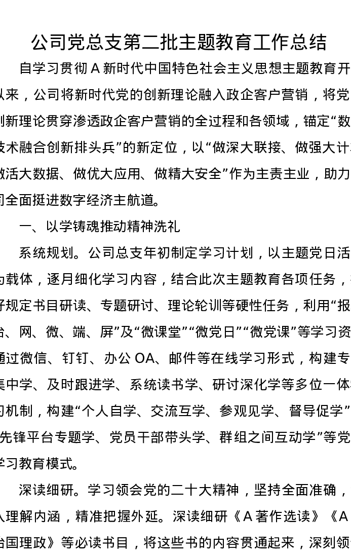 公司党总支第二批主题教育工作总结(特色社会主义思想)