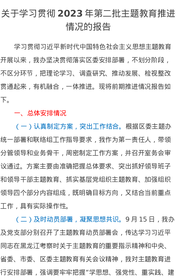 关于学习贯彻2023年第二批主题教育推进情况的报告(特色社会主义思想)