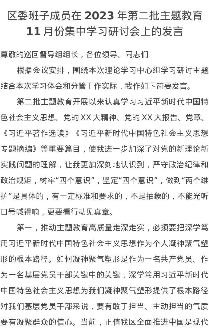 区委班子成员在2023年第二批主题教育11月份集中学习研讨会上的发言(特色社会主义思想)