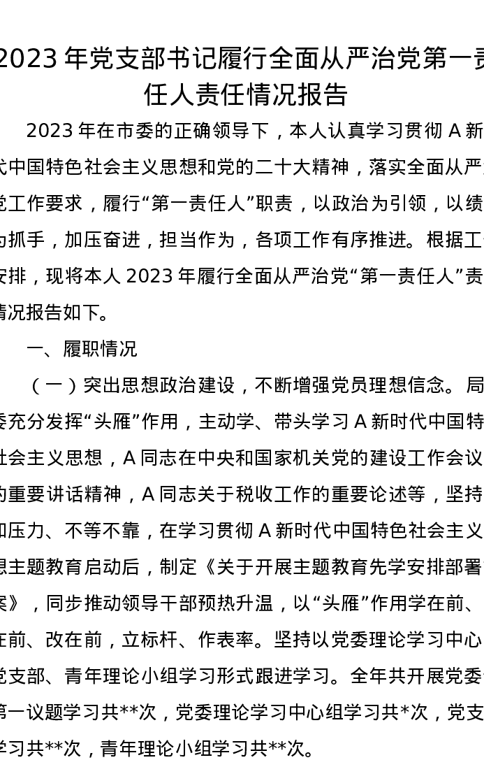 2023年党支部书记履行全面从严治党第一责任人责任情况报告
