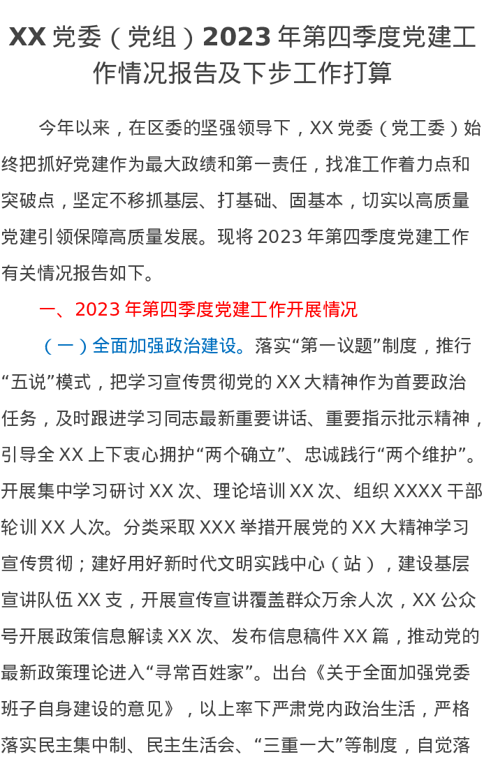 XX党委(党组)2023年第四季度党建工作情况报告及下步工作打算