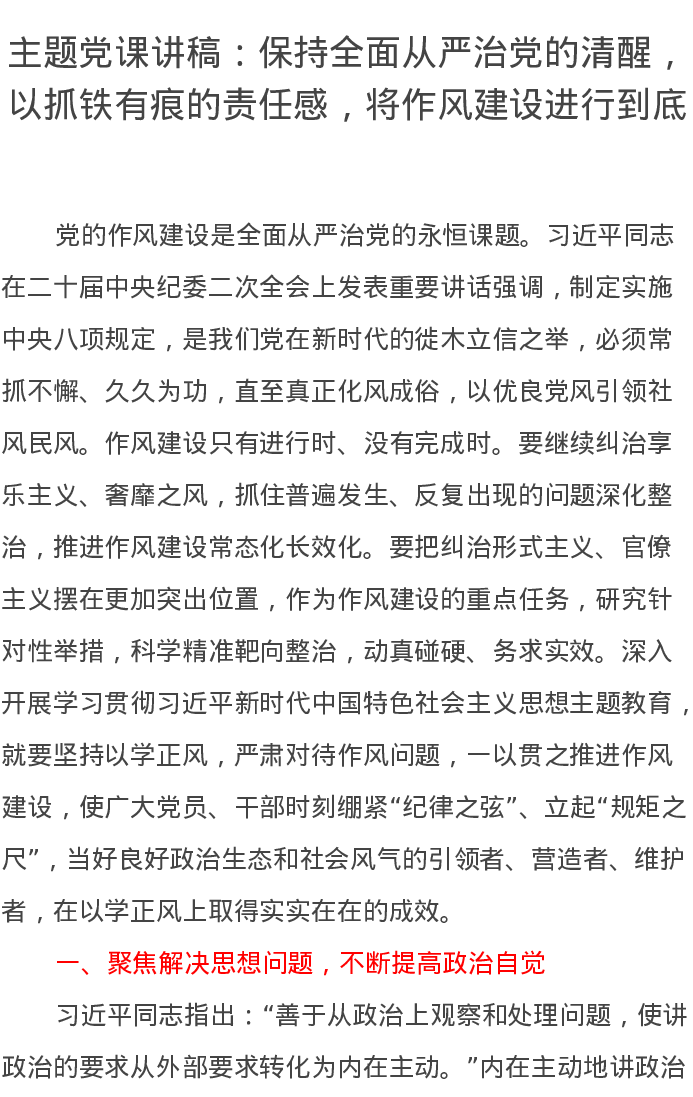 主题党课讲稿:保持全面从严治党的清醒,以抓铁有痕的责任感,将作风建设进行到底