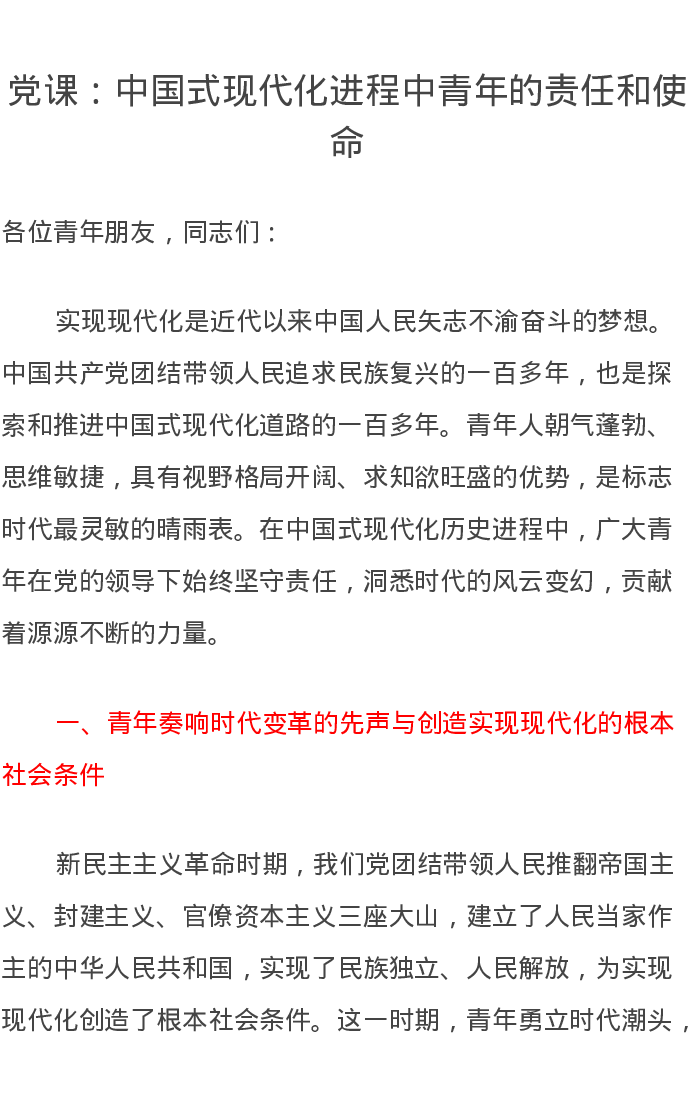 党课讲稿:中国式现代化进程中青年的责任和使命