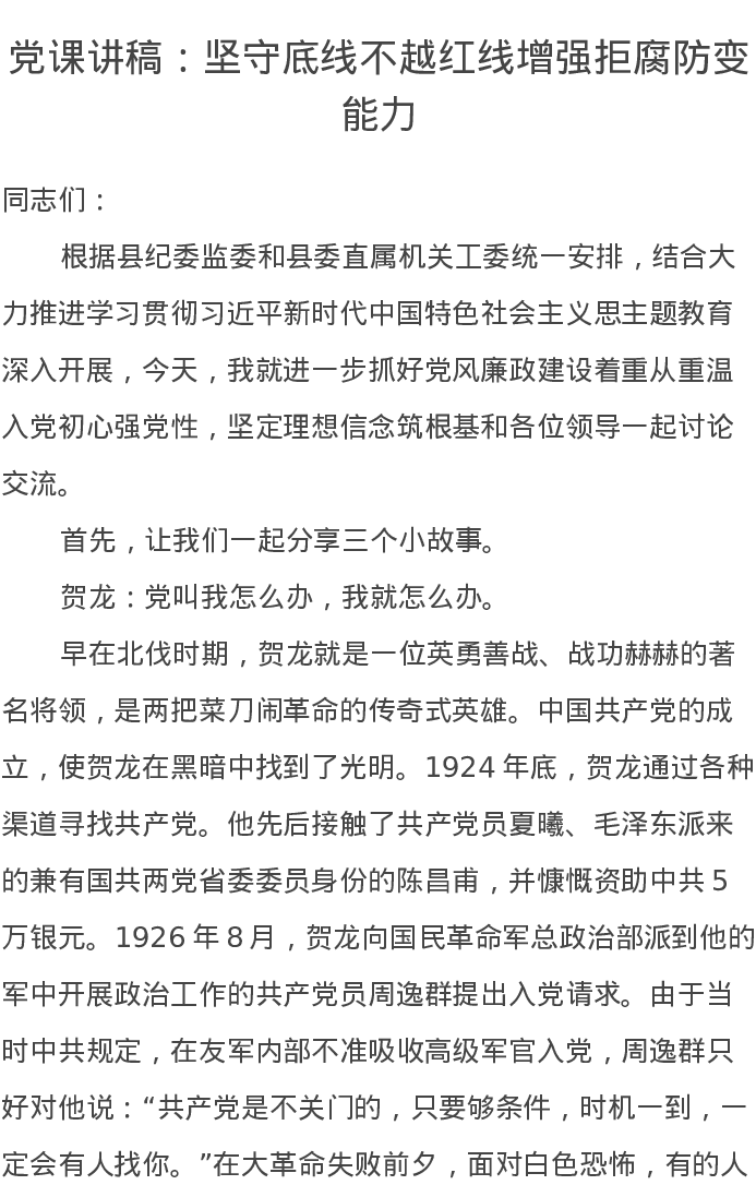 党课讲稿:坚守底线不越红线增强拒腐防变能力