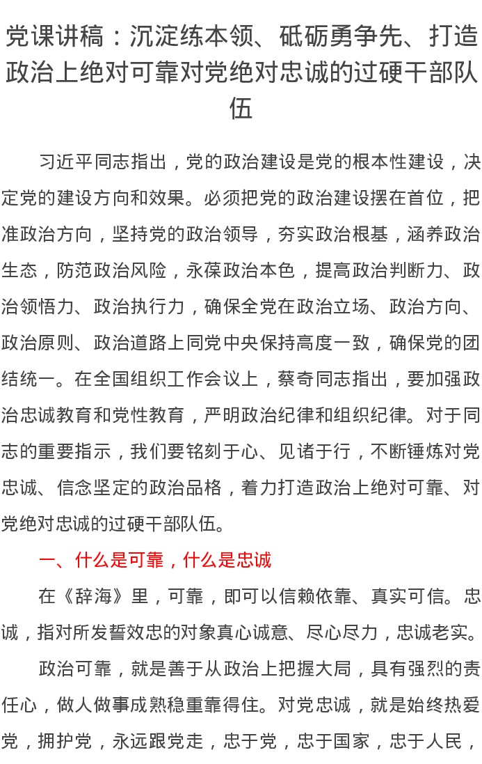 党课讲稿:沉淀练本领、砥砺勇争先、打造政治上绝对可靠对党绝对忠诚的过硬干部队伍