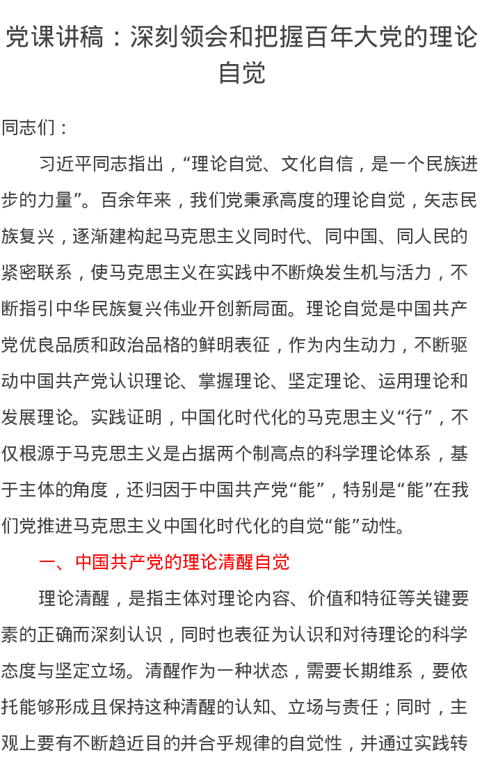 党课讲稿:深刻领会和把握百年大党的理论自觉