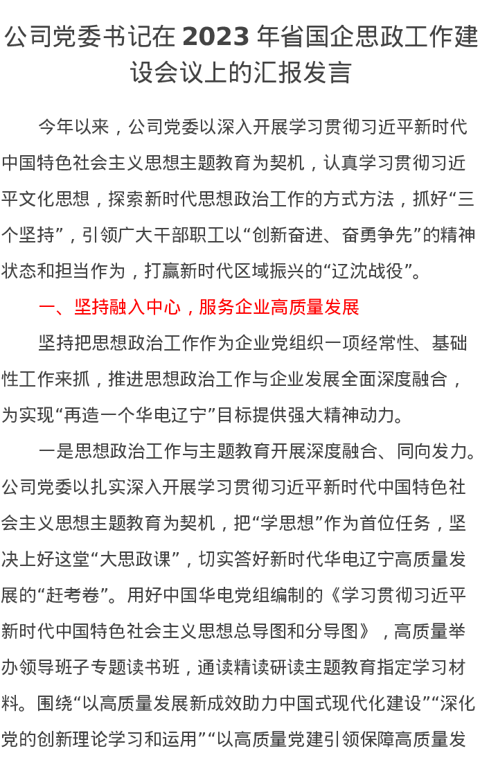公司党委书记在2023年省国企思政工作建设会议上的汇报发言