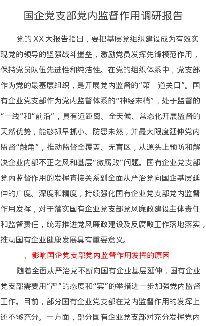 国企党支部党内监督作用调研报告